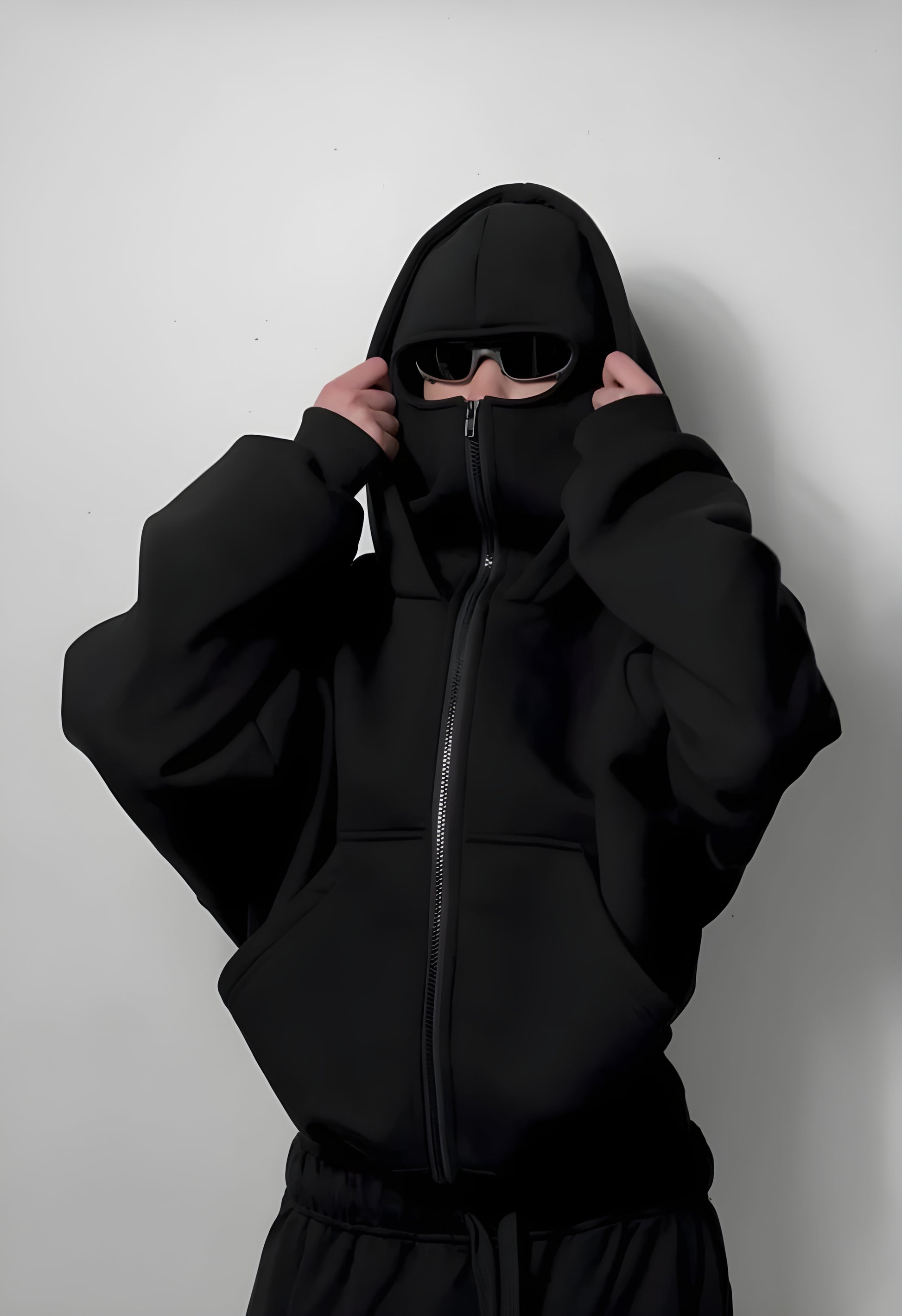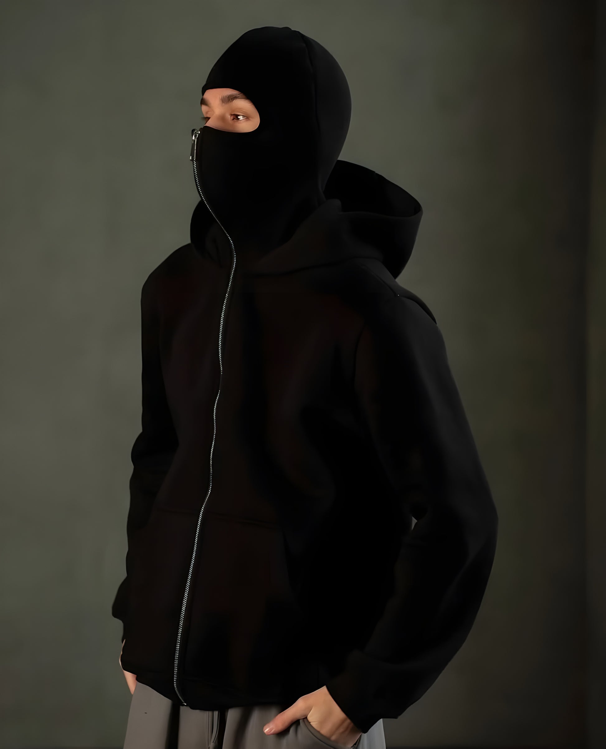 Not your average hoodie. The Balaclava Hoodie combines ultimate comfort with a sleek, urban edge. Featuring a full zip that extends up to cover your face, this piece doubles as both a hoodie and a balaclava, making it perfect for streetwear lovers, travelers, and anyone who wants a versatile fit.